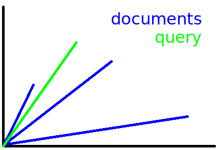 Calculating the similarity of a document related to a specific query is like calculating the similarity of the document vector and the query vector. As a simple visual model, this could be something like the smallest angle between the document and the query vector. The smaller the angle, the more similar the document is to the query.