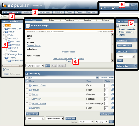 The Administration Interface contains multiple windows, interfaces and tabs. We identify six areas of the interface and explain each of them in detail. When you log in, the Administration Interface defaults to the Content structure tab and displays the top-level node in the site's content hierarchy. In other words, you will most likely be shown the content from the front page of your website.