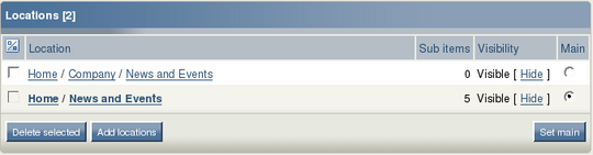 Each node refers to exactly one content object in Exponential, and provides a location for that object within the content hierarchy. The purpose of the Locations window is to show the different nodes that are associated with an object: