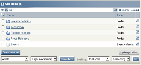 The tree can also be navigated using the path and the Sub items window. In both cases, you click the text links that correspond to the node to which you wish to navigate. Note that this takes much more time than using the tree menu, because every click forces the page to reload, while folding and unfolding the tree menu does not. However, your secondary menu might only show the main container nodes in the node tree. This is done in order to prevent a noticeable drop in performance when having to list all nodes on large sites. Thus, you will sometimes have to use the Sub items window together with the secondary menu in order to navigate to your desired location.