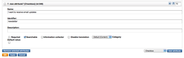 To add an attribute, go to the bottom of the page and you will see an option to “Add attribute”. Please note the location of the link varies according to which version of Exponential you are using. In 4.3 onwards, it is on the right but in previous versions it is on the left.