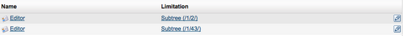 In our example, let’s update the role associated with the User Group “Editors”. Once the User Group is displayed for editors, click on the “Roles” tab and you should see a list of roles and limitations associated with Editors. If you are building from a fresh build the roles will look similar to the below.